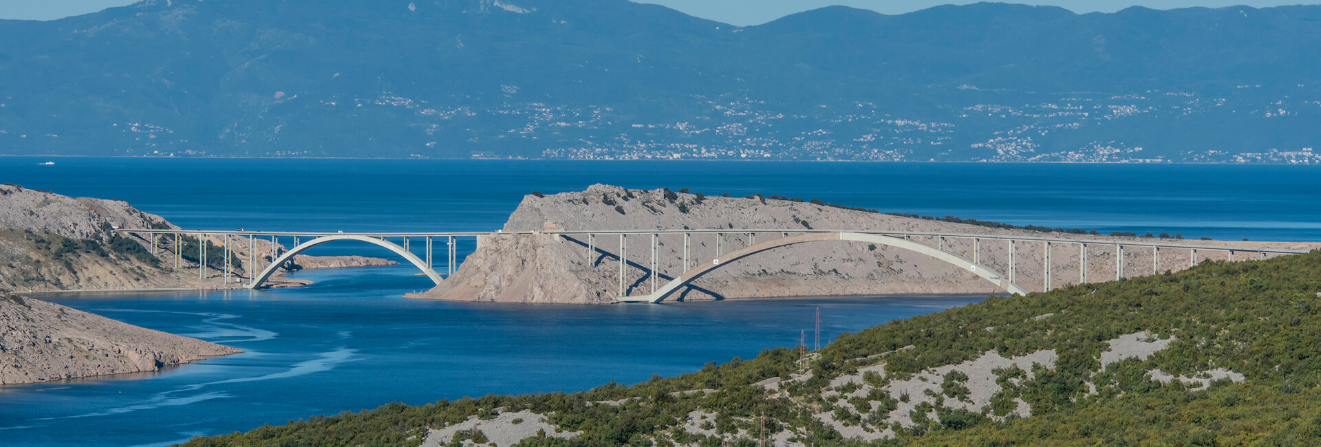 Weil Rijeka zwar nett zum Flanieren ist, aber nicht das Ziel unserer Reise, fahren wir am nächsten Morgen gleich hinüber. Die Stahlbeton-Bogenbrücke wurde 1980 erbaut, ist mit allen Zufahrten 1.450 Meter lang und mautpflichtig. Sie erspart den Reisenden eine Fährverbindung, die doch erheblich mehr Zeit in Anspruch genommen hätte. Fähren steuern die Insel auch heute noch an – von den Inseln Cres und Rab. Aber um auf diese zu gelangen, sind wiederum Fährverbindungen nötig.