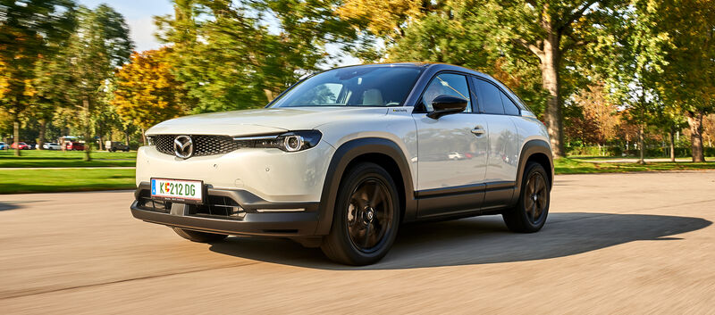 Wer bislang nur mit "normalen" Autos unterwegs war, soll sich auch im rein elektrischen Mazda MX-30 zu Hause fühlen. So komponierten die Japaner für den E-Motor ein künstliches Fahrgeräusch, das an einen Benziner erinnert. Und auch das für E-Autos typische druckvolle Beschleunigungsvermögen wurde gedämpft und entspricht einem herkömmlichen Fahrzeug.