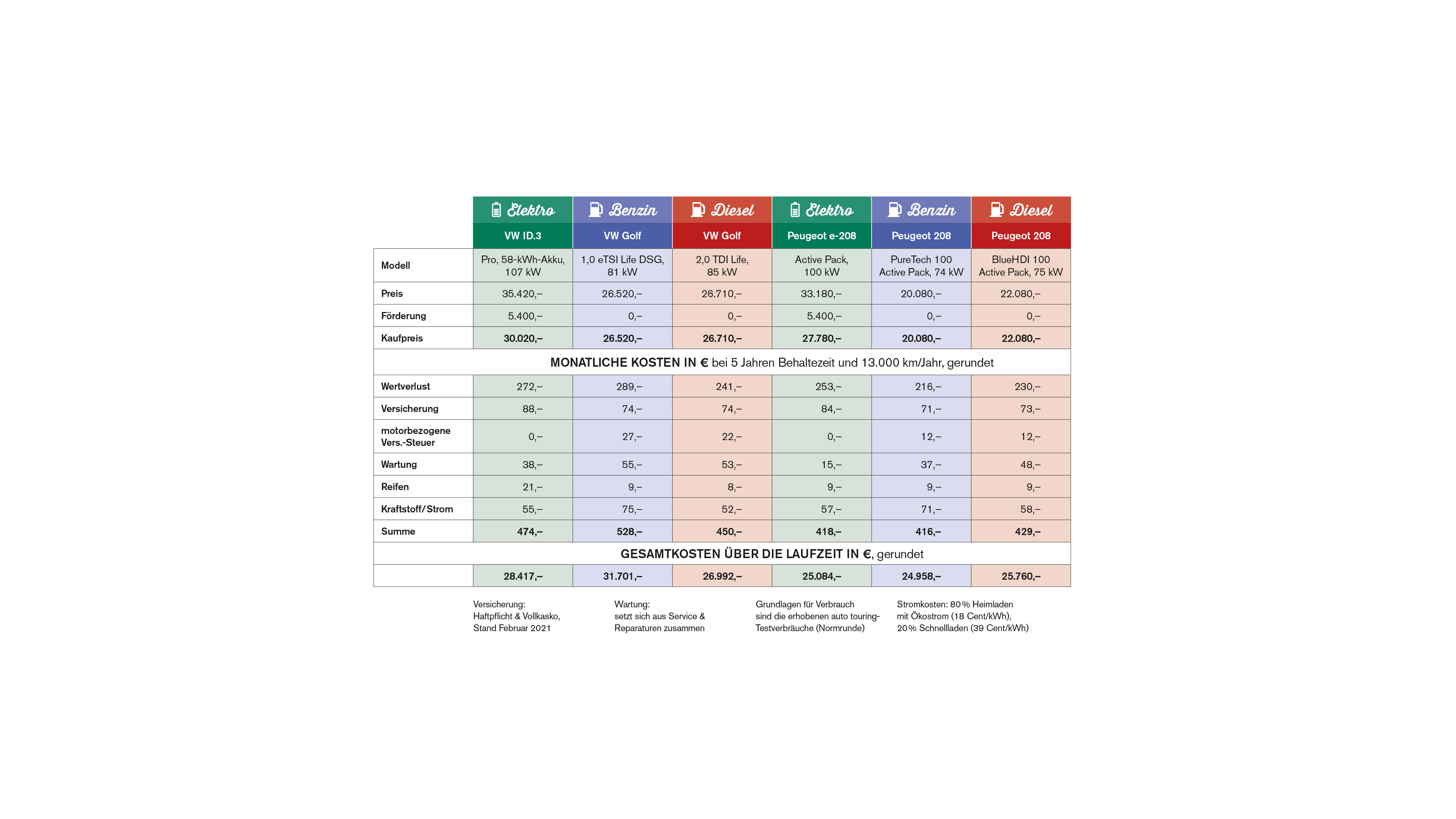 Auf fünf Jahre gesehen liegen alle drei Peugeot auf gleichem Kostenniveau, am günstigsten stellt sich der Benziner dar. Bei den drei VW kommt der ID.3 nach fünf Jahren um etwa 3.300 Euro billiger als der Benzin-Golf, die geringsten Kosten im Laufe dieser Zeit verursacht der VW Golf Diesel.