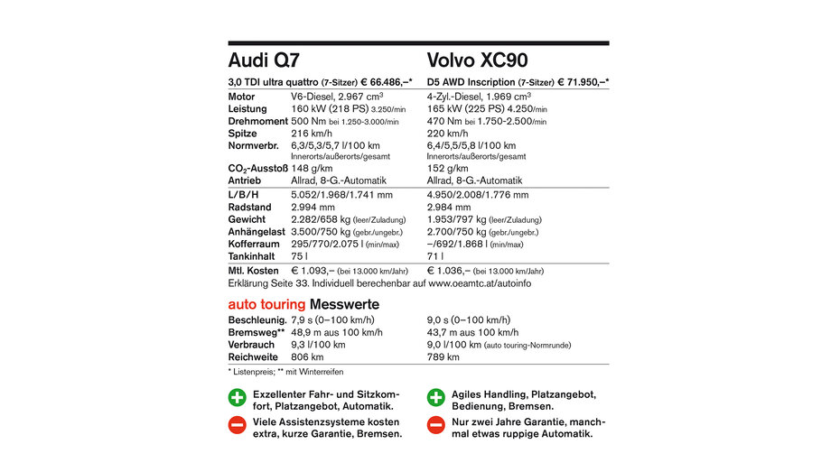 Mit dem Audi Q7 und dem Volvo XC90 schicken jetzt zwei SUV-erprobte Hersteller ihre Neuen, jeweils in zweiter Generation, ins Rennen. Beide haben Preise beim diesjährigen ÖAMTC-Autopreis Marcus gewinnen können (siehe ab Seite 12).