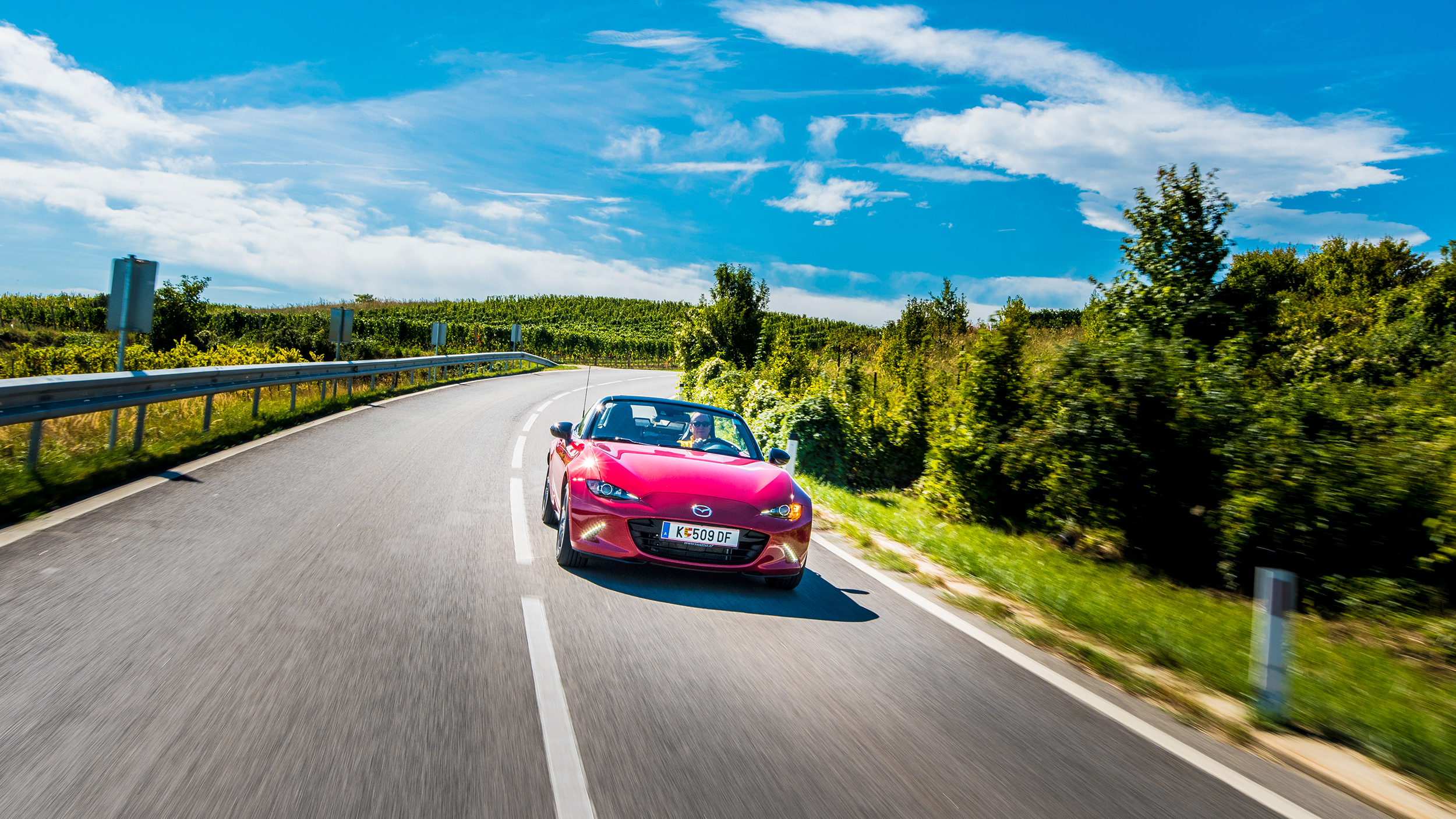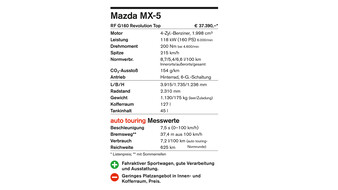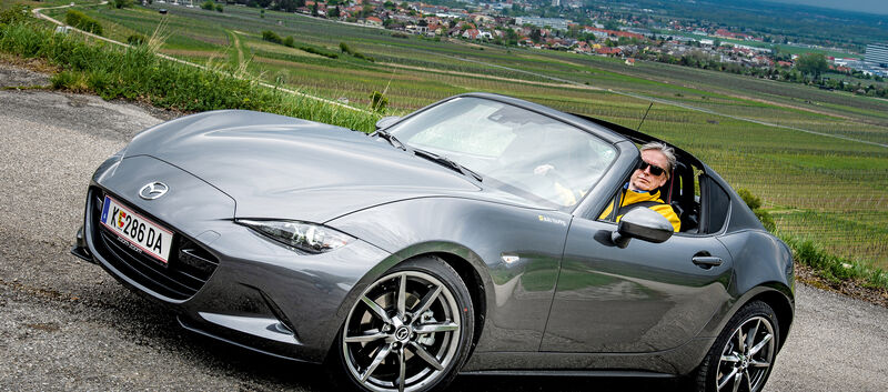 Wir fuhren den MX-5 RF mit dem stärkeren der beiden Motoren: 2 Liter, 160 PS. Er sprintet in 7,5 Sekunden von 0 auf 100 km/h und läuft, wenn es denn sein muss, über 200 km/h Spitze, aber glaubt mir: Das muss nie sein.