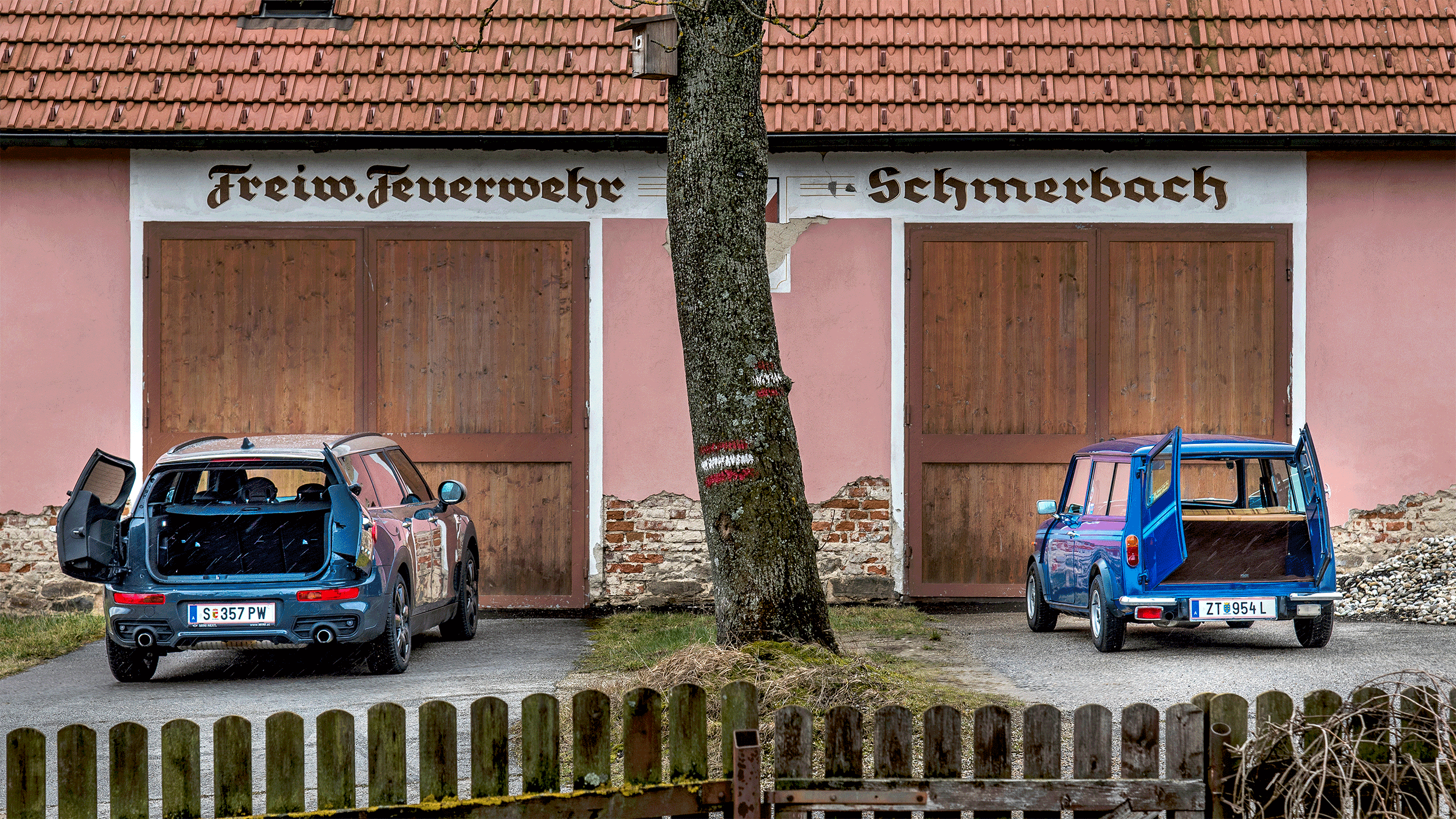 Mini? Was ist da dran Mini?" Die Frage meiner Zapfsäulen-Nachbarin, die da einen Kleinwagen fernöstlicher Herkunft betankt, ist gerechtfertigt. Denn ihr fahrbarer Untersatz ist optisch um zumindest eine Klasse kleiner. Kein Wunder. Der neue Clubman, quasi der Kombi von Mini, ist genau so groß wie der aktuelle VW Golf. Seine gestreckte Silhouette erinnert unverkennbar an den Mini Clubman Estate aus den 1970er-Jahren, der beim Fototermin dabei war und daneben echt putzig wirkte.