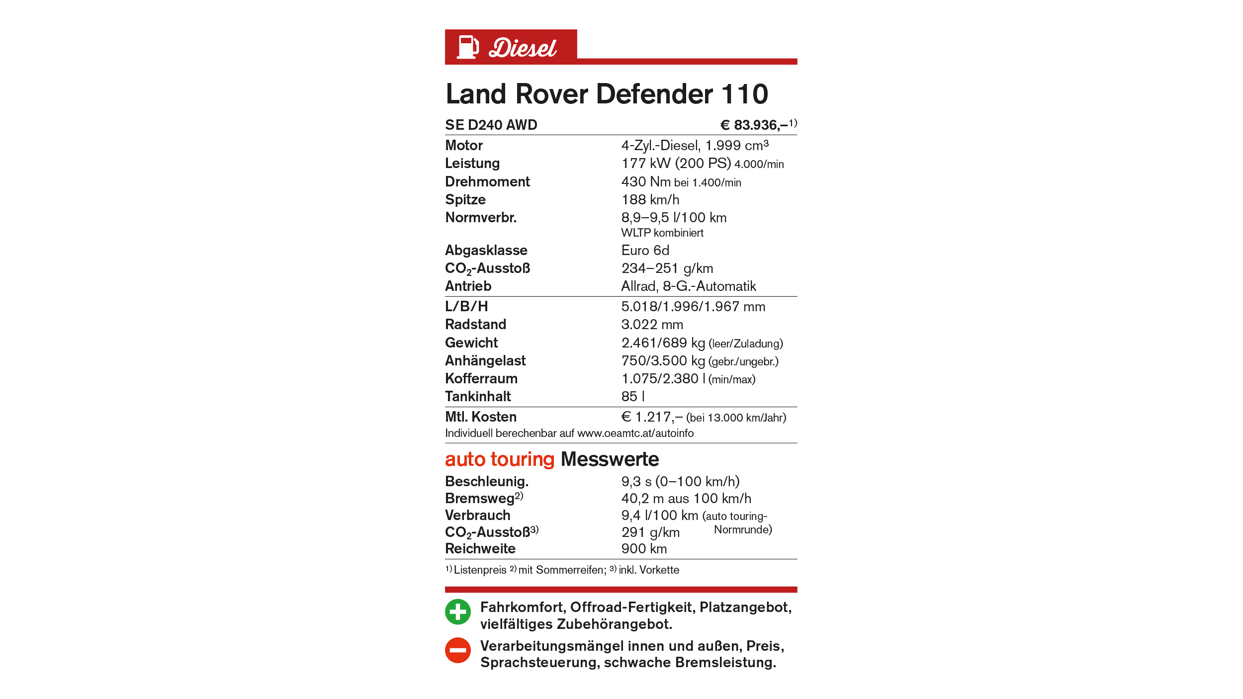 Man mag das ja zu Beginn gar nicht so recht wahrhaben bzw. unterliegt man einfach einer Fehleinschätzung, aber spätestens der unmittelbare Umstieg und Vergleich mit dem Vorgänger öffnet einem die Augen – und man erkennt: Das Luftfederfahrwerk ist eine Wucht, es lässt den Defender satt und sicher auf der Straße liegen, nimmt im Gelände den Erschütterungen das Erschütternde.