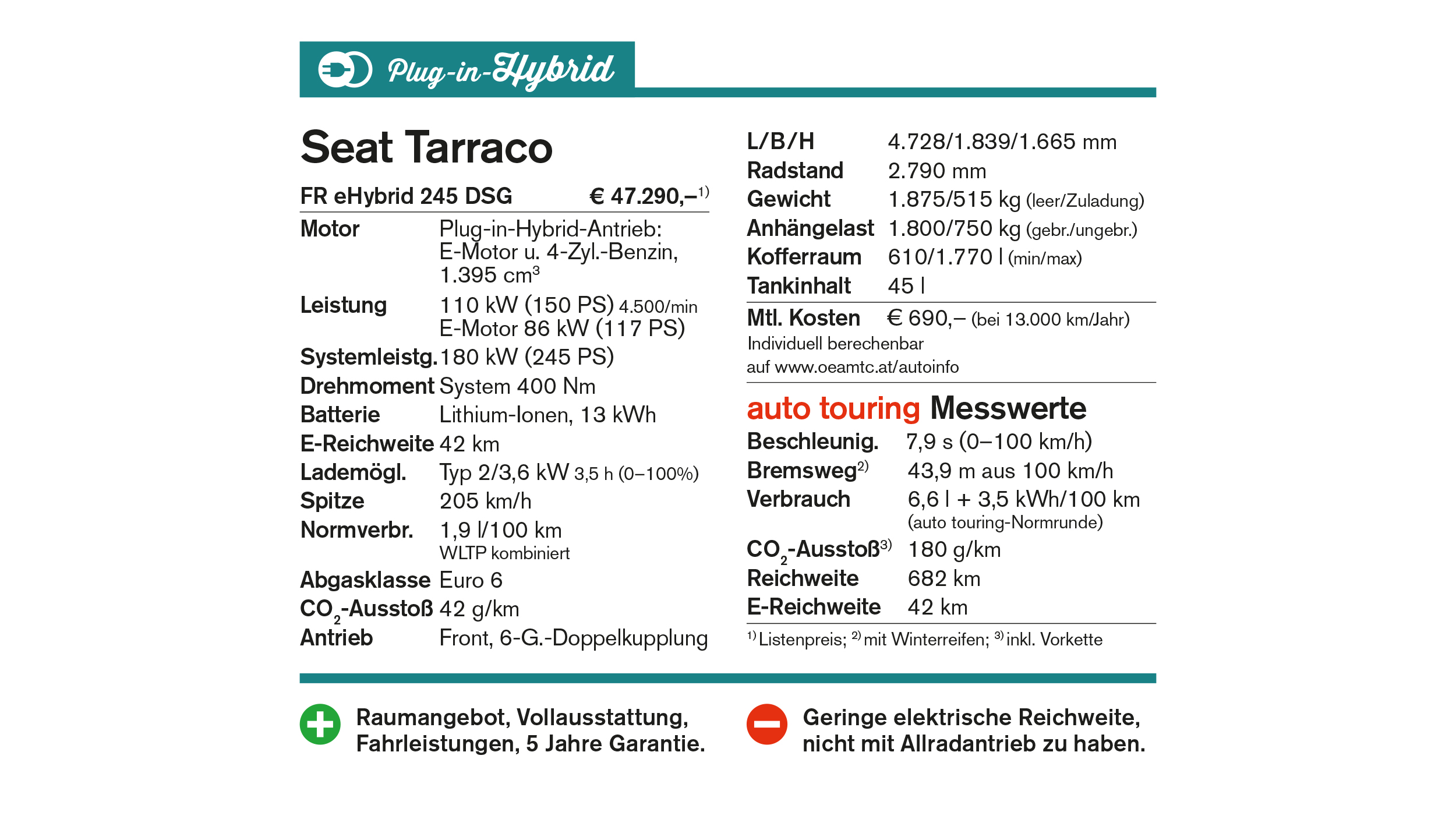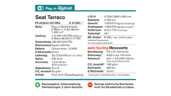 Und noch zwei Hinweise: Wer den Akku nie auflädt (siehe Eingangskapitel dieses Tests), fährt mit den übrigen Tarracos sicher günstiger. Und vielleicht sogar mit Allradantrieb – denn der ist für den eHybrid nicht lieferbar.