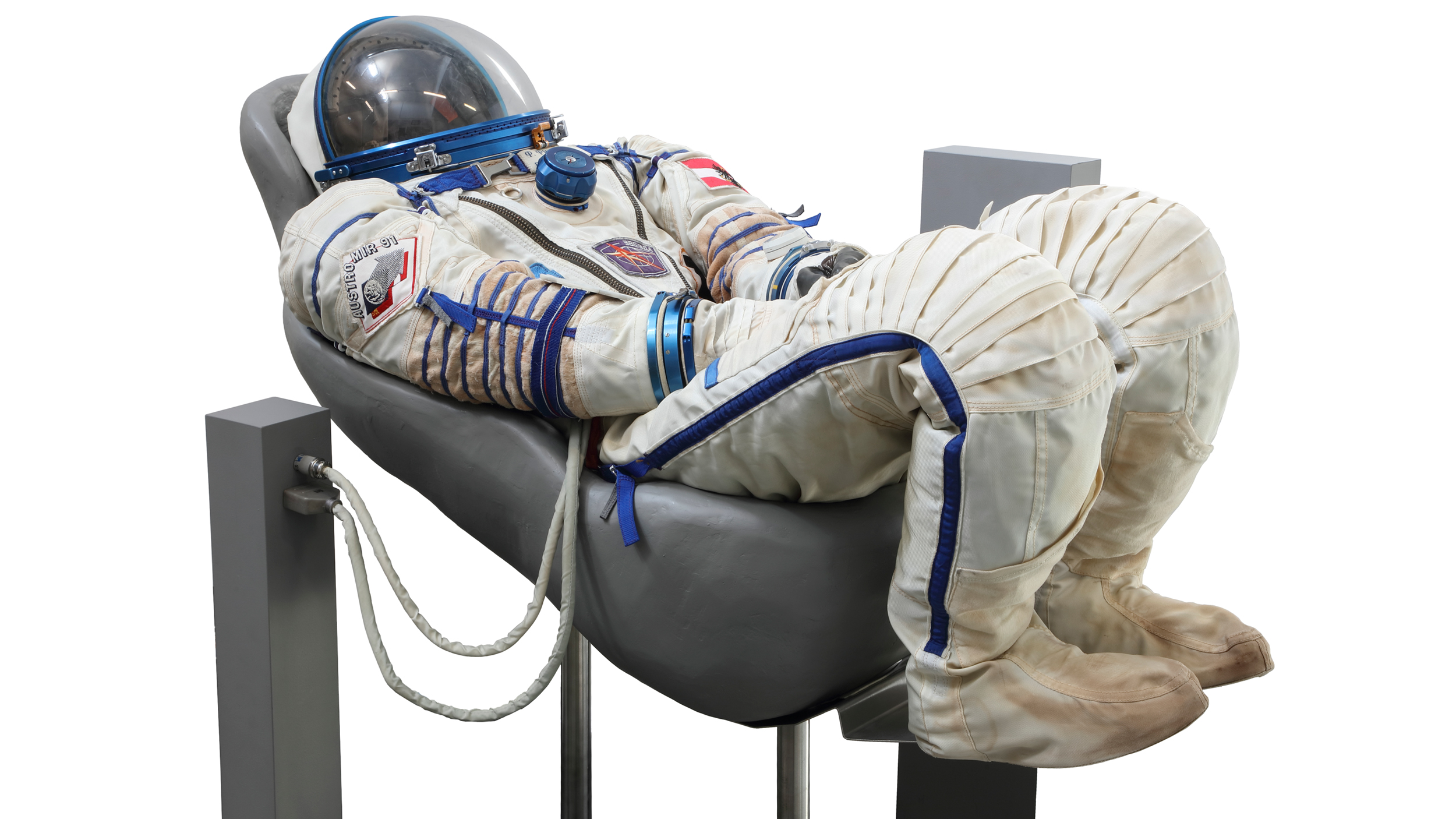 Franz Viehböck: Nein, den konnte man nach dem Start ausziehen und gegen einen blauen Trainingsanzug tauschen. Der Raumanzug wird bei kritischen Manövern angezogen, damit man im Falle des Entweichens der Luft einen Schutz hat. Kritische Manöver sind beispielsweise Beschleunigungen und das Andocken an die Raumstation. Sobald das vorbei ist, braucht man ihn nicht mehr. Die ganze Zeit nur im Raumanzug, das wäre mühsam (lacht).