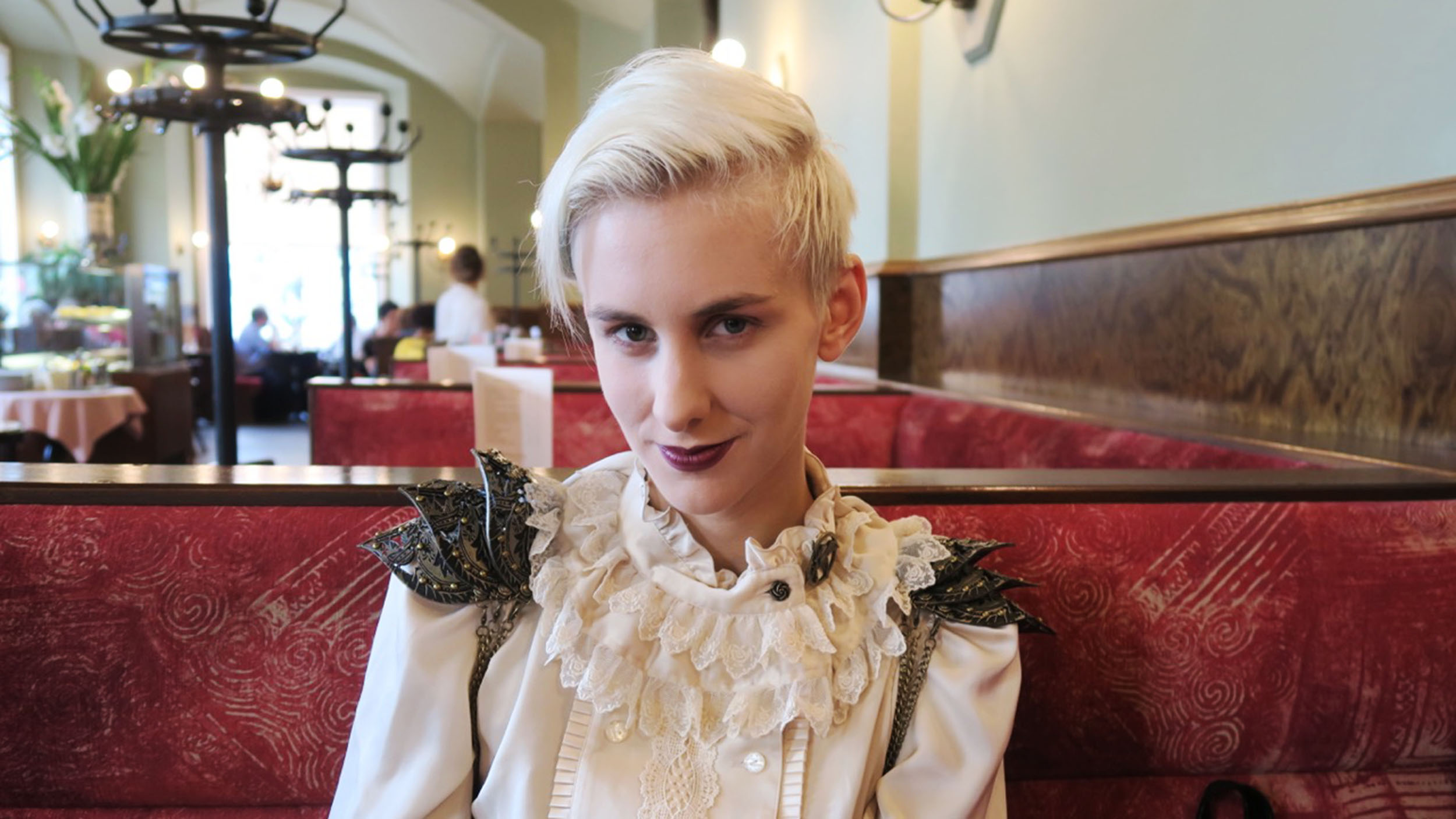 Die 24-jährige Wortkünstlerin ist gekleidet, als wäre sie auf der Bühne: hochgeschlossene Rüschenbluse mit Schulterklappen aus Metall (siehe Foto unten), die Hose betont ihre Wespentaille. "Das trage ich immer, wenn ich außer Haus bin", erzählt die Steirerin. Ihre angemalten Lippen sind der einzige Farbklecks.