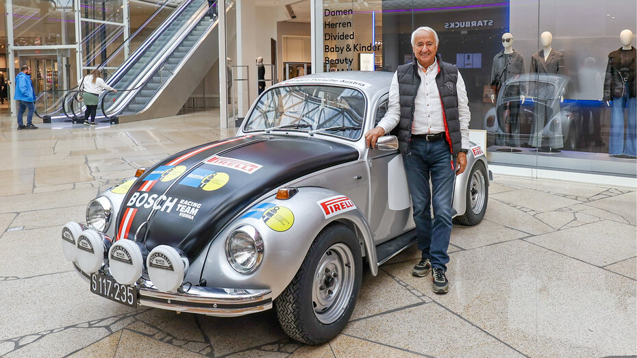Wir trafen Herbert Grünsteidl in einer Pizzeria in der Linzer PlusCity. Die erinnert an diesem Donnerstag im Oktober mehr an einen Service Park (quasi der Boxengasse im Rallyesport) als an das Shopping Center, das sie eigentlich ist. Rally1-Boliden, WRC2-Autos – und mittendrin: Grünsteidls Salzburg-Käfer, mit dem er in den 1970ern Rallyes bestritt. Und der jetzt wieder in seinem Besitz ist.