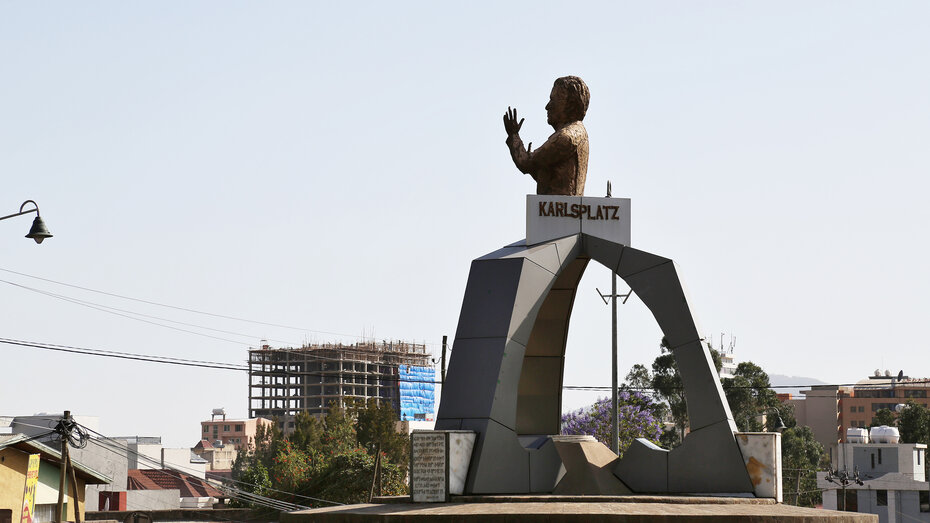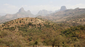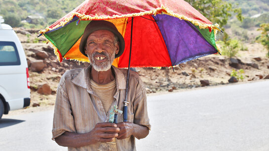 Der Mann trägt eine alte Hose und ein zerrissenes Hemd. Als er vor seinen Wellblech-Verschlag tritt, schützt er sein ergrautes Haupt mit einem bunten, ausgefransten Schirm vor der stechenden Mittagssonne. Er winkt uns zu. Ist er krank? Ein Autostopper? Ein Unfall? Wir halten den Kleinbus an und steigen aus. Der Mann zeigt auf eine gigantische Felsnadel, die aus dem Hochplateau aufragt. Getnet, unser junger äthiopischer Guide, übersetzt. Der vermeintliche Anhalter ist Priester. Er sammelt von Vorbeifahrenden, die ein Foto von der spektakulären Landschaft machen wollen, Spenden für ein Kloster zu Ehren Johannes des Täufers, das unterhalb der Felsnadel, dem "Finger Gottes", errichtet wird. Wir bedanken und verbeugen uns. Spenden. Fotografieren. Fahren weiter.