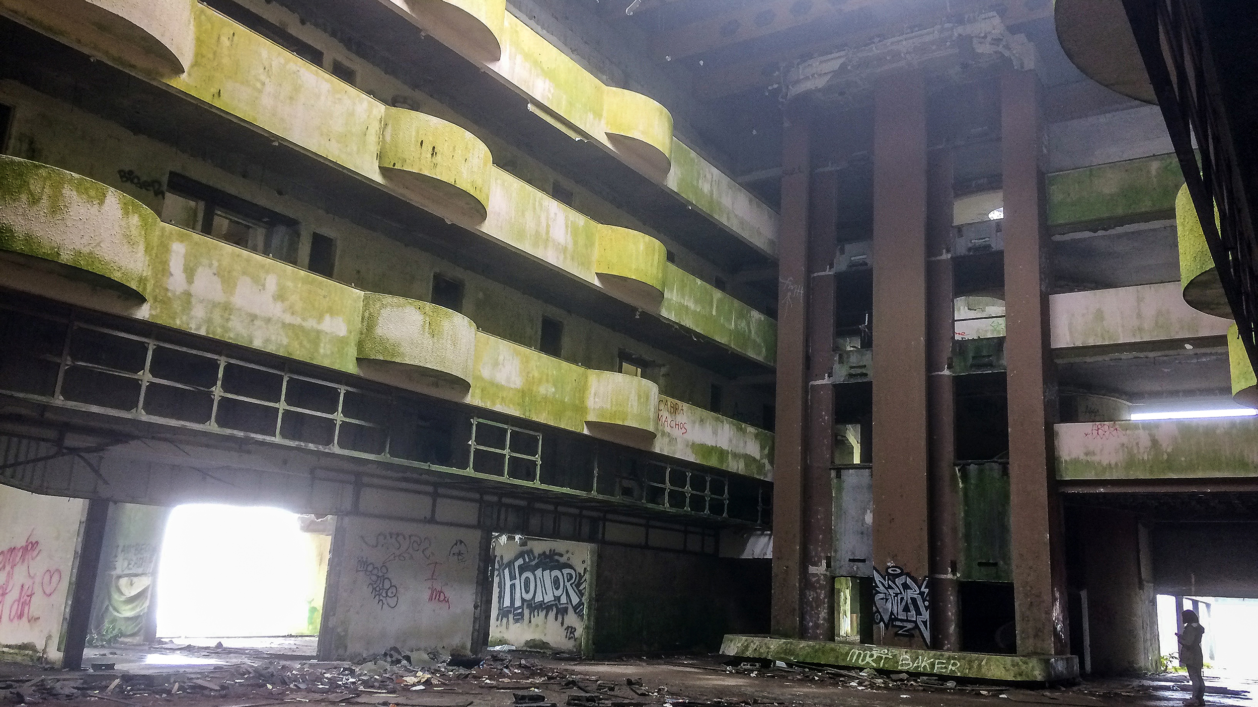 - Echt gruselig: - Echt gruselig: Düstere Hotel-Lobby, die Liftkabinen fehlen, Moos an den Betonbrüstungen, es tropft von der Decke, überall Graffiti und Müll. © Helmut Eckler