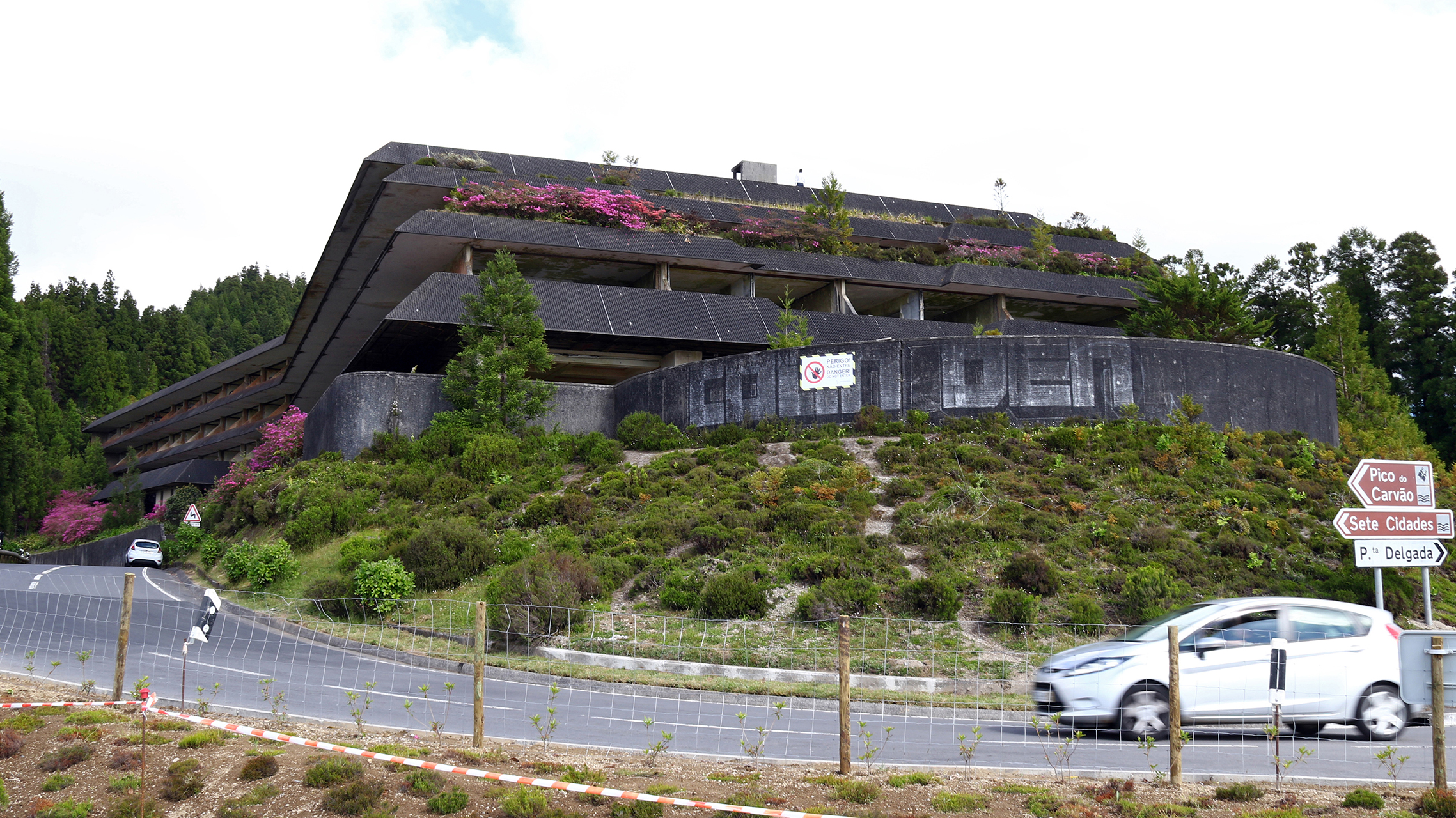Ein paar Kilometer weiter stoppen wir am Vista do Rei, der königlichen Aussicht. Einerseits ist der Blick auf den riesigen, 300 Meter tiefer liegenden Riesenkrater von Sete Cidades atemberaubend. Andererseits zeigt sich an der Ruine des Betonbunker-ähnlichen Hotels "Monte Palace" aus den 1980er-Jahren, wie ein Projekt schiefgehen kann, über Jahre hindurch mit tatkräftiger Unterstützung von Vandalen zerfällt und von der Natur zurückerobert wird.