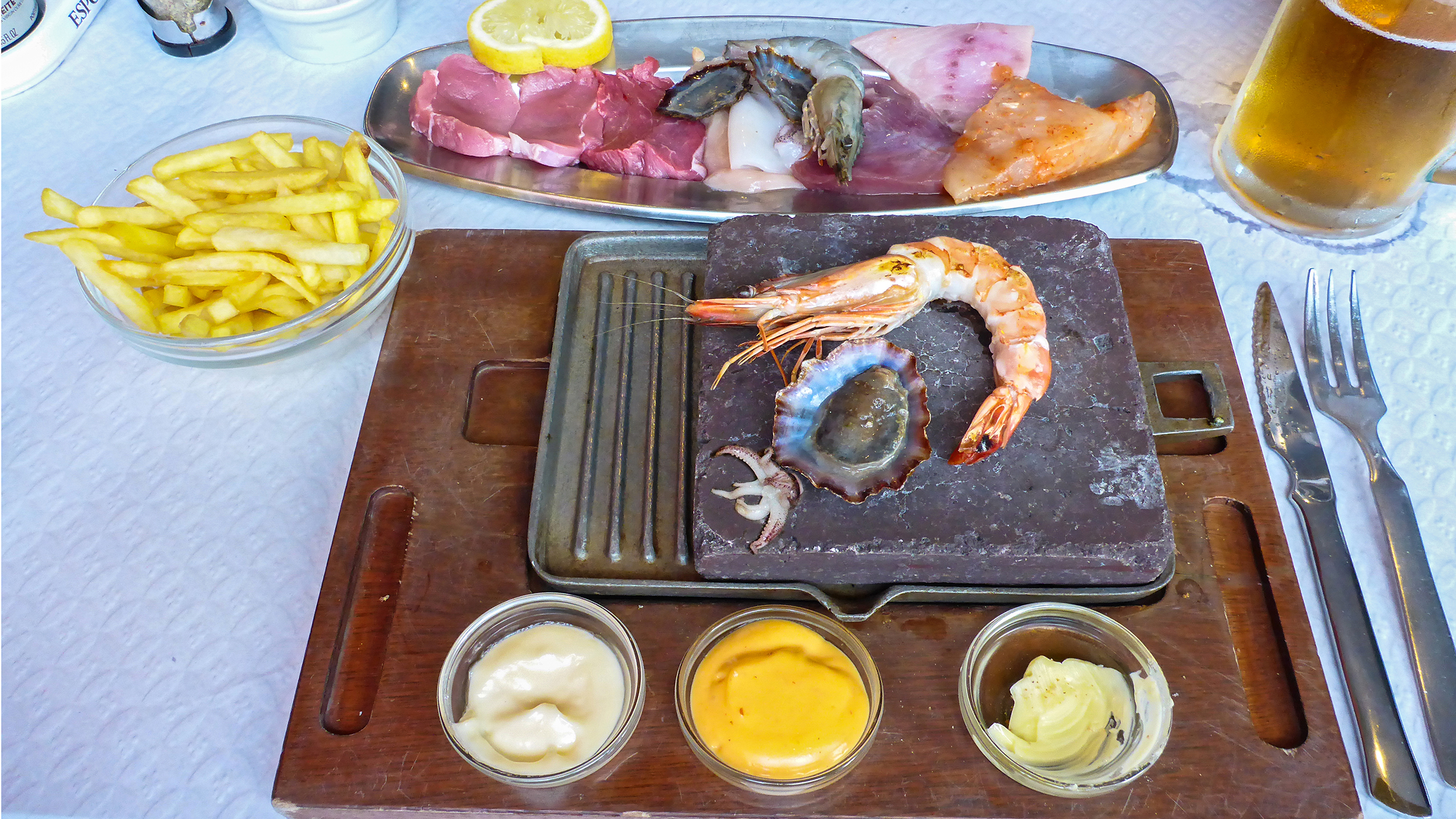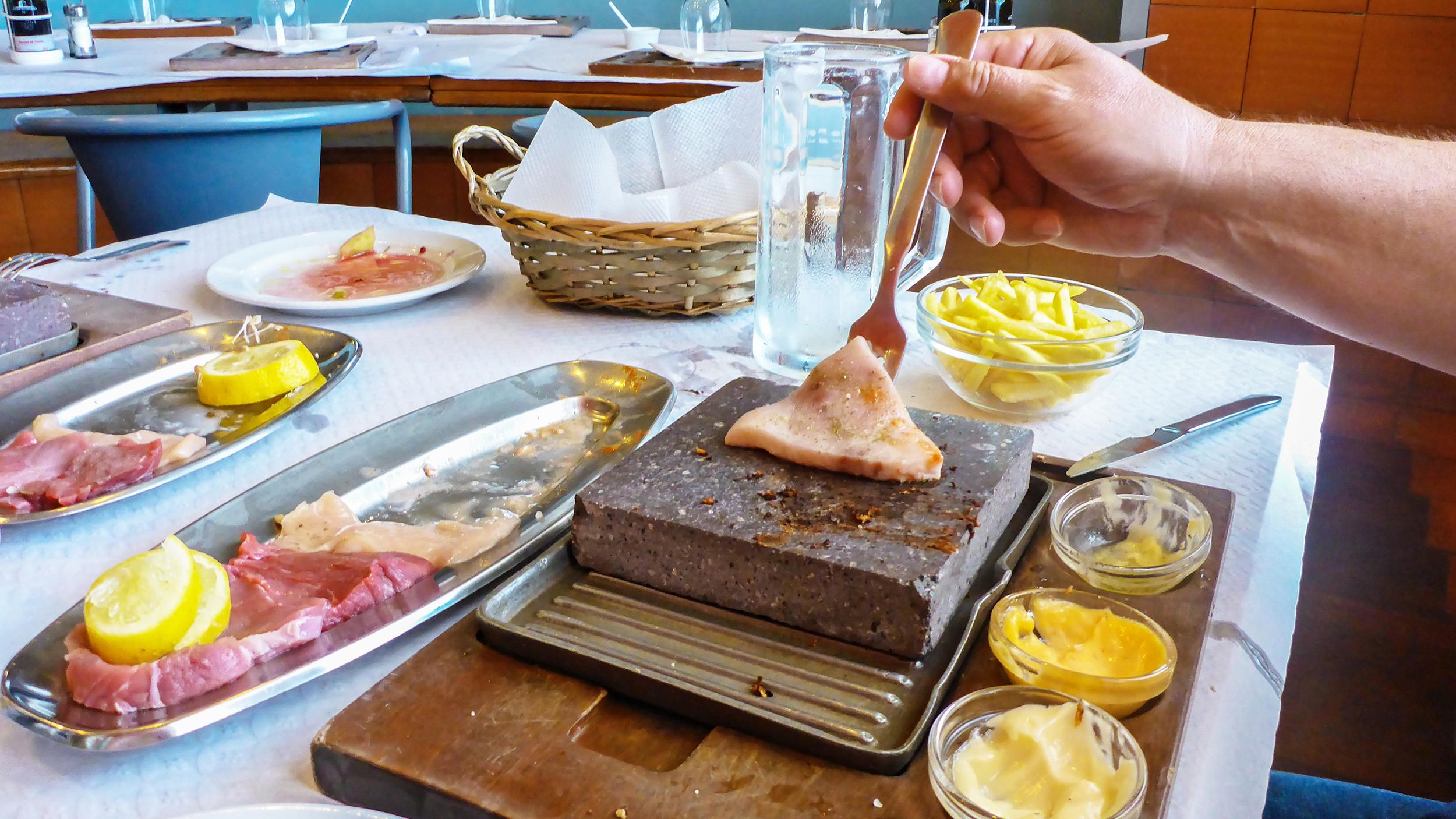 Zum Abendessen haben wir uns gleich im Hafen von Horta das Canto da Doca ausgesucht. Hier gibt's ausschließlich Selbstgebrutzeltes vom Lava-Stein. Wir wählen aus verschiedenen Fleisch- und Fisch-Kombinationen, die schön trappiert auf Platten serviert werden. Dazu eine 400 Grad heiße Lavaplatte, etwa 15 mal 15 cm groß und los geht's. Das Fleisch grillen wir selber, gewürzt wird nur mit Salz, Kräuterpfeffer und Zitronensaft, sonst wird der Stein verschmutzt. Saucen, Pommes und Salate dazu – fertig. Ein Gedicht, und etwas ganz Spezielles.