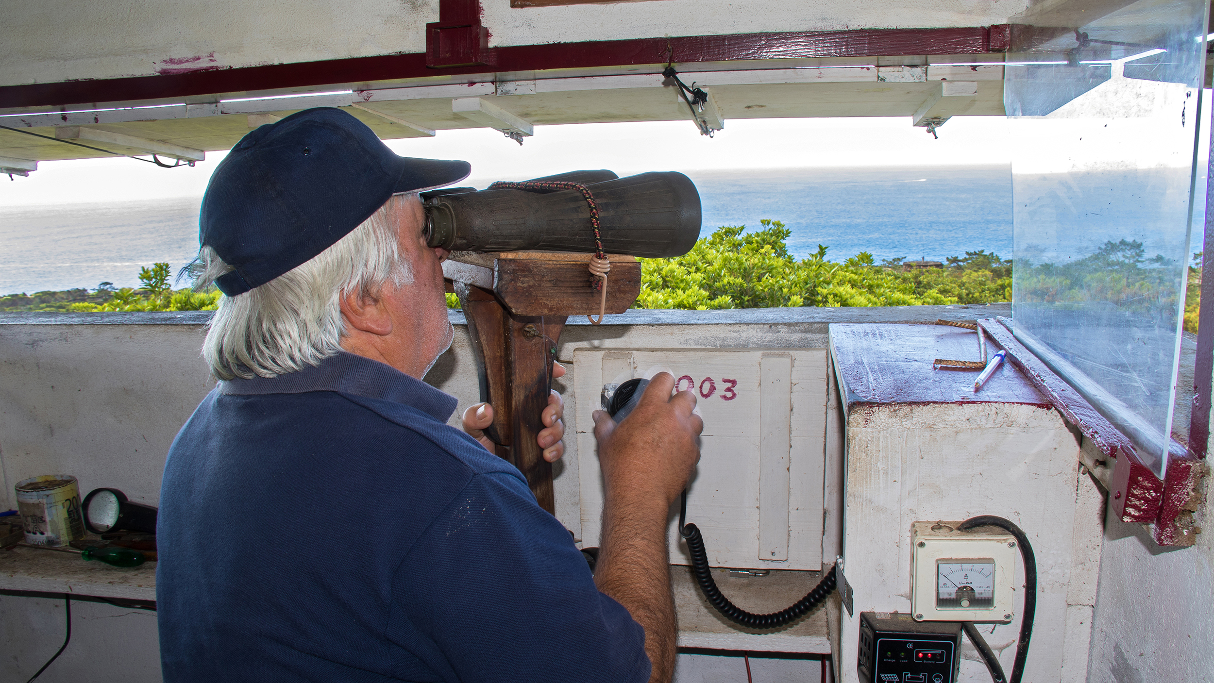 Wir biegen ab, fahren über eine holprige Schotterstraße, halten an, steigen aus und hören irgendwo am steilen, dicht bewachsenen Hang über uns lautes Reden. Jenny meint: "Er ist da" und ein paar Schritte später stehen wir in der Steinhütte von Antero, dem Whale Spotter. Er hat gerade drei Pottwale im Visier, ca. acht Kilometer weit draußen und leitet per Funk zwei Wal-Beobachtungsboote hin. Keine Ahnung, wie, denn Hinweise wie "beim großen Baum links" funktionieren auf offener See ja nicht – und Portugiesisch versteh' ich auch nicht…