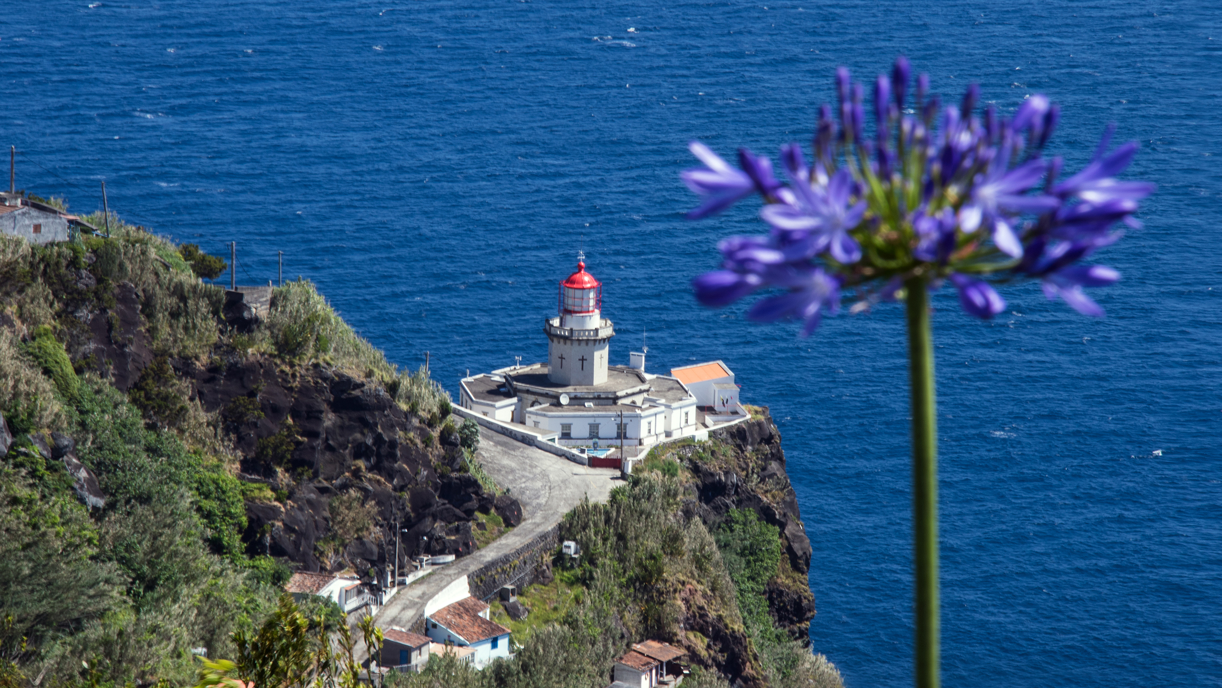 Um nach Faial da Terra zu kommen, nehmen wir die nördliche Küstenstraße und fahren weiter die Ostküste runter Richtung Süden – Gott sei Dank! Denn die Straße schlängelt sich großteils hoch über den Klippen dahin, bietet uns grandiose Ausblicke auf kleine Buchten und auf den malerischen Leuchtturm Farol da Ponta do Arnel. Dann wiederum geht's durch dichten, sattgrünen Urwald, stellenweise sind die Straßenränder von grellbunten Blumen gesäumt, die ersten Hortensien entfalten ihre üppige Pracht, mannshohe Agapanthus-Lilien beugen sich über die Leitplanken.