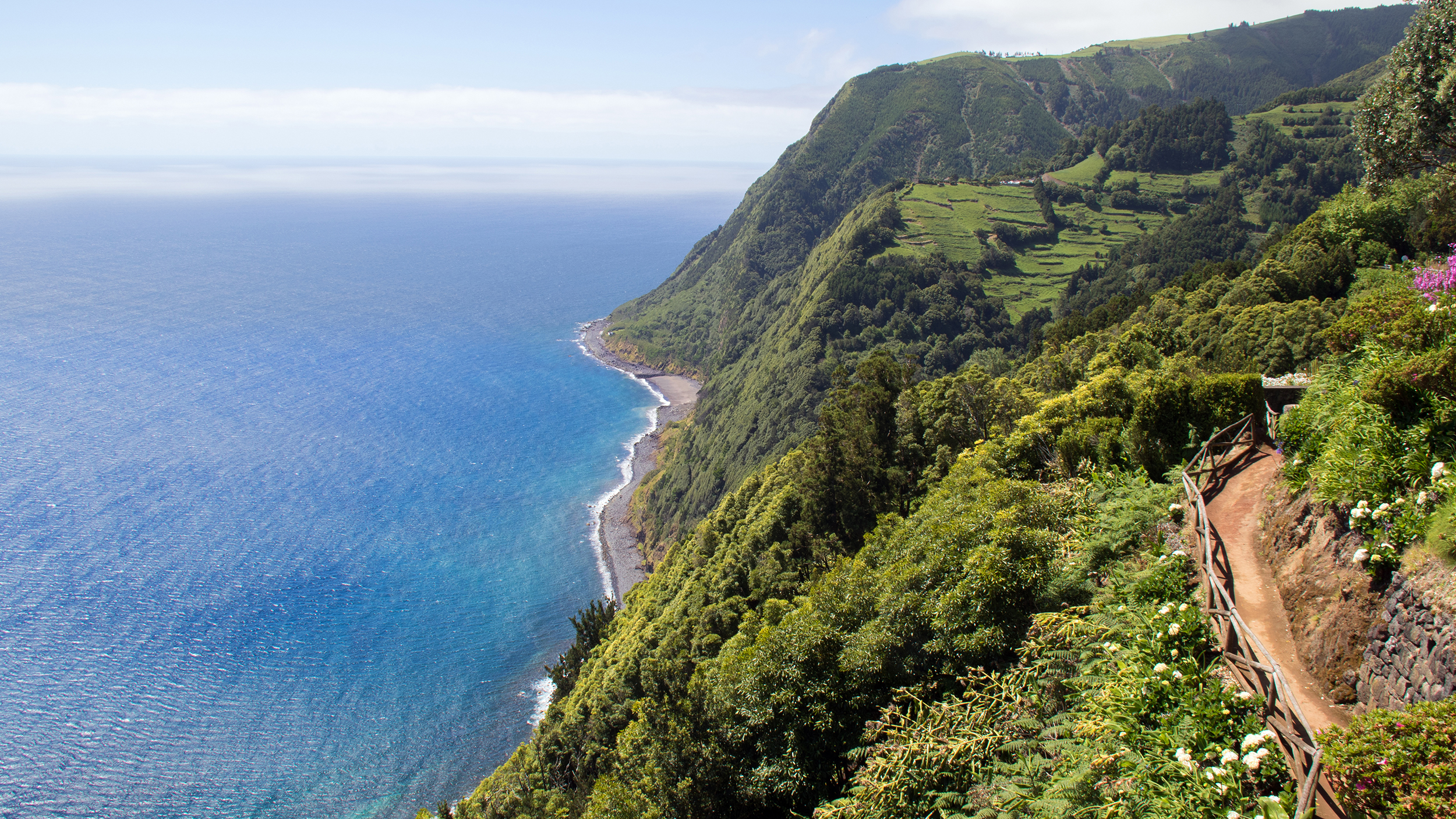 Am Inselrand geht’s an allen Seiten oft senkrecht runter, unzählige Miradouros (Aussichtspunkte) bieten spektakuläre Panoramen. An einigen Stellen sehen wir nun von oben doch winzige Buchten oder schmale, flache Küstenstreifen, die Fajãs – gesprochen "Faschas". Manche sind nur auf steilen Pfaden zu Fuß erreichbar und Ziele spektakulärer Wanderrouten. Leider haben wir zu wenig Zeit…