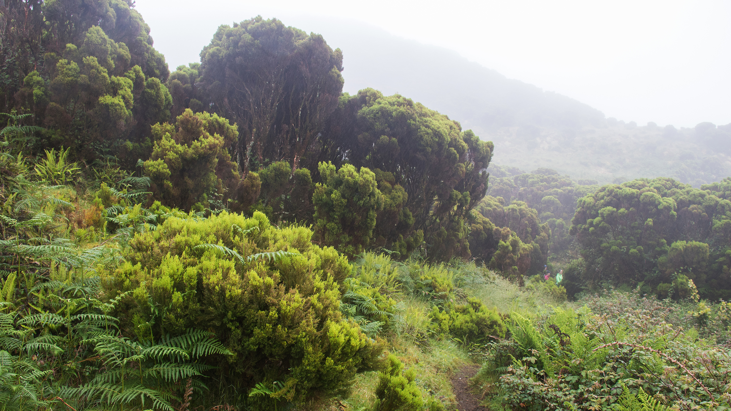 Die Erica azorica ist mit unserer Alpen-Erika verwandt – nur halt ein bisserl höher (beachten Sie zum Vergleich die Wanderer). Und im Nebel oder Nieselregen wirken die Buschwälder geheimnisvoll, fast märchenhaft.