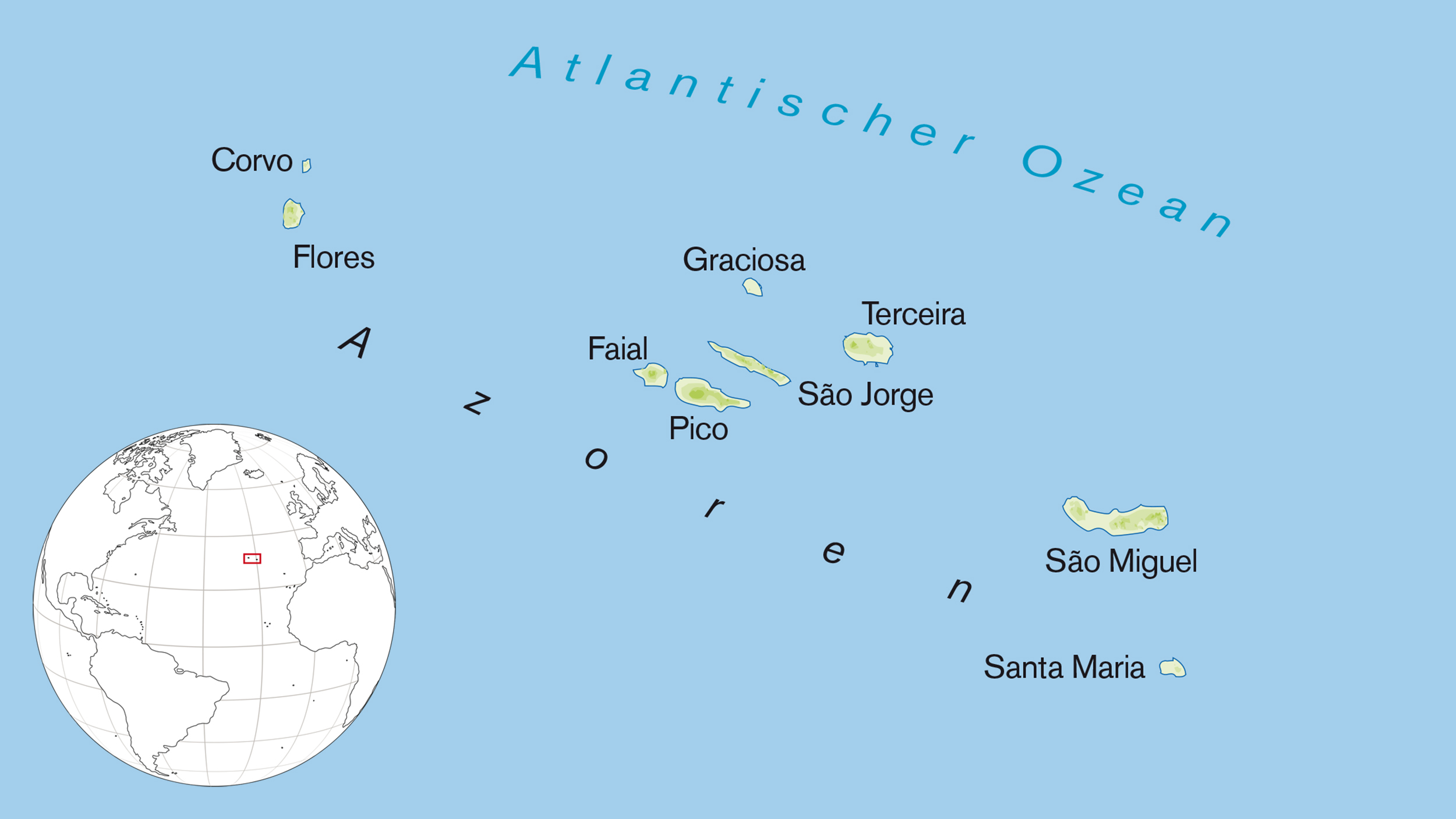 Die Azoren liegen auf dem mittelatlantischen Rücken, an dem die Kontinente auseinanderdriften – und zwar genau dort, wo nordamerikanische, eurasische und afrikanische Platte ein „Dreiländereck“ bilden. Dieser Lage verdanken die neun Azoren-Inseln ihre Existenz. Im Osten die größte, São Miguel mit der Hauptstadt Ponta Delgada. Sie liegt auf der eurasischen Kontinentalplatte, wie auch die fünf zentralen Inseln: Auf Terceira bleiben wir ein paar Tage, ebenso auf Faial, von wo aus wir mit der Fähre Tagesausflüge nach São Jorge und nach Pico unternehmen. Graciosa lassen wir dieses Mal aus, genau wie die beiden östlichen Inseln, Flores und Corvo, die bereits auf der amerikanischen Kontinentalplatte liegen und sich allmählich von den anderen Inseln entfernen, rund zwei Zentimeter pro Jahr. Und das kleine Santa Maria im Südosten hat auf der Azoreanischen Mikroplatte irgendwie einen Sonderstatus.
