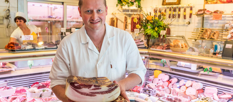 Nördlich der Alpen wird der Schinken eher geräuchert, südlich an der Luft getrocknet. Im Kärntner Gurktal, das von der alten Triester Straße südlich von Hirt abzweigt, versteht man sich – ganz dem Alpe-Adria-Gedanken verhaftet – auf beides. In Straßburg betreibt die Familie Seiser einen Gasthof mit Fleischerei und Stefan Seiser darf sich sogar höchst offiziell Speckkaiser 2016 nennen. Ausgezeichnet wurden sowohl sein geräucherter Bauchspeck als auch der luftgeselchte Schinkenspeck. Wir haben den Speckkaiser in seiner Fleischerei besucht.