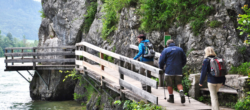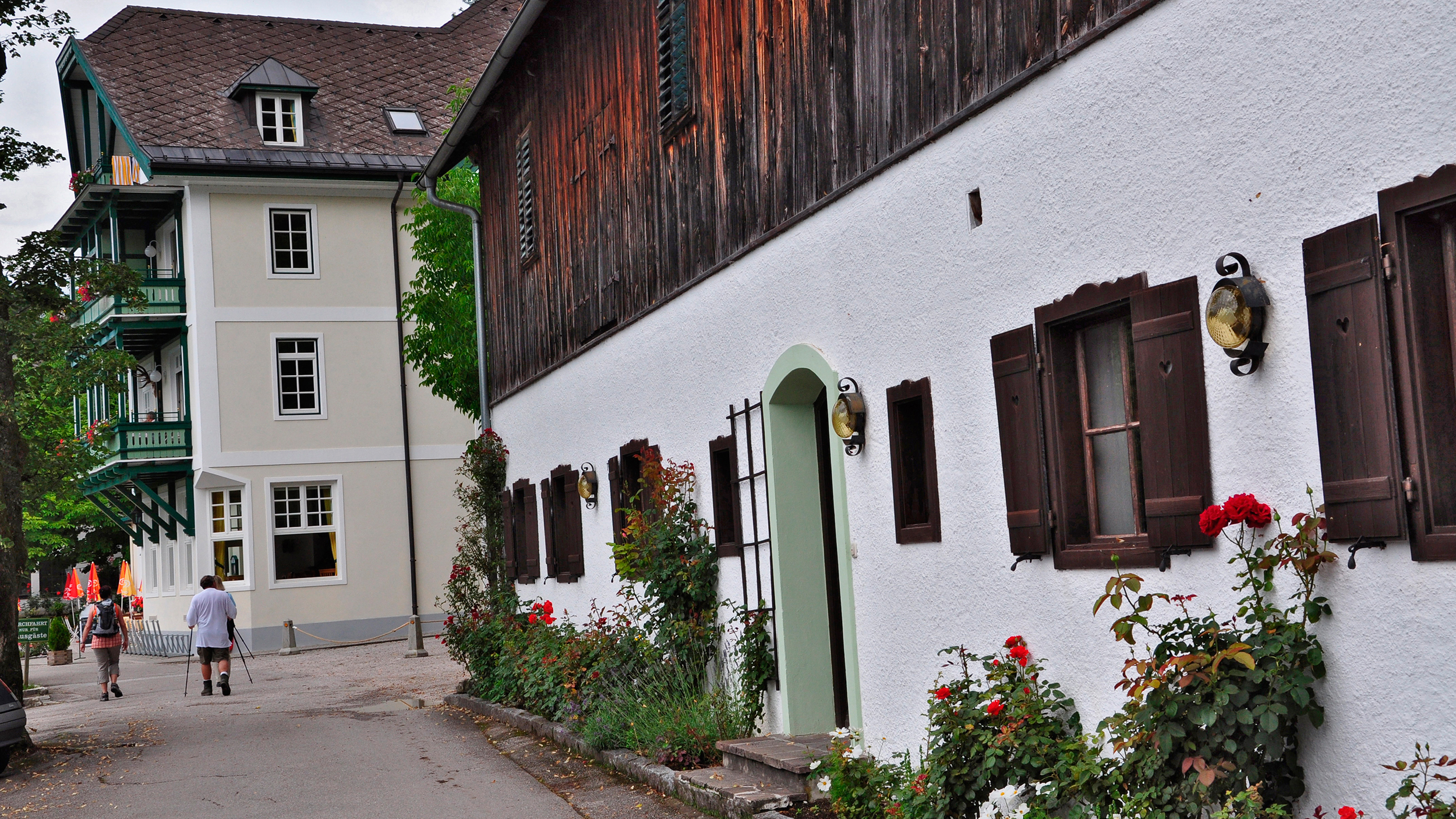 Wolken ziehen auf – hoffentlich bleibt es trocken. Wo die Straße am See zum einspurigen Weg wird, sind sie erstmals zu sehen, die fürs Salzkammergut so typischen Bootshäuser. Manche pur wie anno dazumal, manche ausgebaut zu tollen Ferienwohnsitzen. "Jetzt sind wir bereits auf der Bahntrasse", macht Reinhard mich aufmerksam. Und plötzlich ein riesiger Gründerzeit-Bau, früher Kinder-Ferienhort, noch früher Hotel, und noch viel viel früher Brauerei mit Ausflugsgaststätte. Und, bis 1957: Station der Salzburger Lokalbahn, wie eine Tafel am Weg erinnert. Ein Jahr nach unserer Wanderung wurde die Holzfassade violett eingefärbt, Gregor Bloeb gab hier den Sigismund Sülzheimer in einer poppig-fetzigen Neuverfilmung des Weißen Rössls. Wir blicken über den See, sind jetzt genau auf der Höhe der Felswand hinter der Falkensteinkirche.