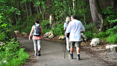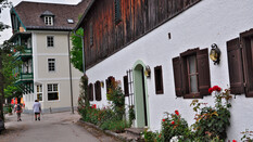 Zuerst geht es zum Friedhof, dort ein Stück bergab zum See und an ihm entlang an der Schiffsstation und am Weißen Rössl vorbei durchs Ortszentrum. Die Pfarrkirche mit ihren berühmten Altären von Schwanthaler und Pracher lassen wir links liegen, hinter dem Hotel Cortisen queren wir die Trasse der Schafbergbahn, marschieren weiter westwärts auf verkehrsberuhigten kleinen Straßen in den Ortsteil Ried. Welch ein Idyll dort, vor allem als die Sonne herauskommt: Schmucke Bauernhäuser mit praller Blütenpracht an den Fensterbänken und Balkonen, mit Gästezimmern abseits des Touristenstroms und direktem Seezugang. Beim Marterl am Ende des Dorfs ein letzter Blick hinunter auf den See, ehe es schräg rechts die Anhöhe hinauf geht. Erst moderat, dann immer steiler durch den Wald. Mountainbiker mit Wadeln, die an Keulen erinnern, überholen uns, die müssen topfit sein! Es ist der Weg der Wallfahrer hinauf zur Falkensteinkirche, die auf 717 Meter Höhe und damit fast 200 Meter über dem See liegt. Bis dorthin geht es an vielen Stationen vorbei, die über uralte Kultstätten, christliche Missionierung und die Einsiedelei bei der Kirche Aufschluss geben. Auch über den "Waxweichen Stein", auf dem der Heilige Wolfgang seine Abdrücke hinterlassen haben soll.