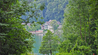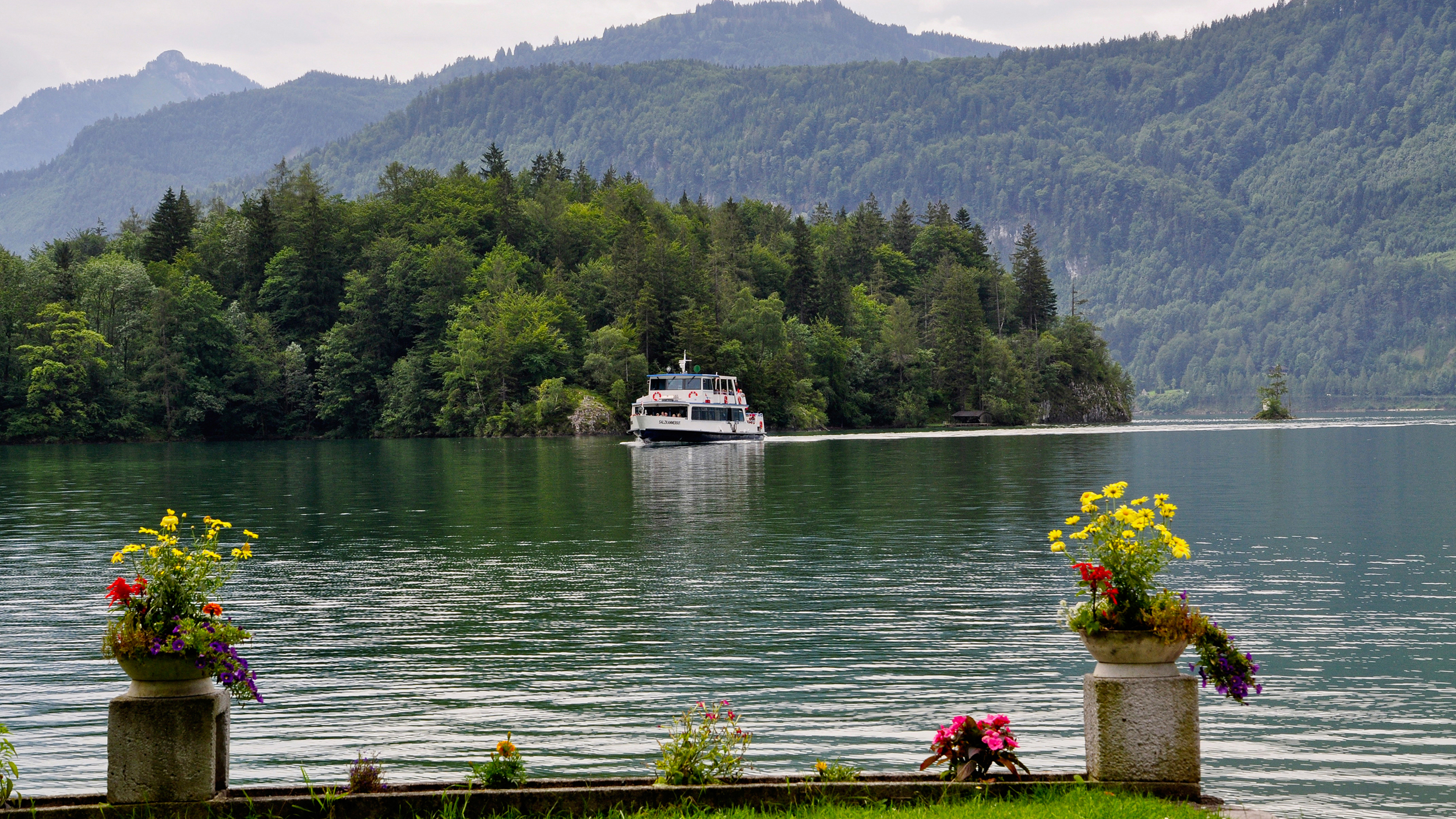 Wie nun weiter? Immer am See entlang. Zwanzig Minuten später erreichen wir St. Gilgen und sind wieder mitten im Leben. Am Wohnhaus der Maria Anna Mozart vorbeikommend steuern wir zielstrebig die Konditorei Dallmann an, es ist mittlerweile Mittag und es ist ziemlich schwül. Eine Cremeschnitte bringt Stärkung. Wir blättern noch im Fotoalbum, das Deutschlands Altkanzler Helmut Kohl gewidmet ist, der hier seine Urlaube verbrachte und die eigens für ihn geschaffene Kanzlertorte genoss, eine Komposition aus dunklem und weißem Schokomousse und Himbeeren. Verführerisch, doch wir müssen aufbrechen.