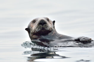 15.30 Uhr. Anlandungen sind auf Pitchy Island nicht möglich, aber auch nicht notwendig, denn die Hauptattraktionen, Largha-Robben und Seeotter, sind besser vom Boot aus zu beobachten. Die Inseln selbst bestehen aus fantastischen Vogelfelsen mit Lummen, Papageientauchern, Kormoranen und Kamtschatka-Möwen. Sie alle bevölkern dieses Tierparadies am Rande der Welt, durch das sanfte Wellen rauschen, die unter Wasser den dichten Kelp wiegen. Innerhalb von Minuten sind unsere Zodiacs von den Seeottern umzingelt, die Eindringlinge werden neugierig beäugt. Und fast eine kleine Sensation: gepunktete Largha-Robben.