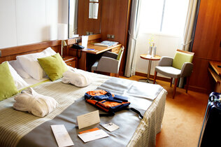 Die Crew begrüßt die neuen Gäste an der Pier mit einem Glas Sekt, das Einchecken dauert nur wenige Minuten. Die Kabinen der Bremen sind hell, freundlich und modern. Wer allerdings glaubt, sich nun sofort von den Strapazen der Anreise entspannen zu können, sieht sich getäuscht. Denn vor den Erfolg haben die Götter den Schweiß gesetzt – in diesem Fall in Person der Sicherheitsoffizierin, die um 17.30 Uhr die gesetzlich vorgeschriebene Seenotrettungsübung für die Passagiere durchführt.