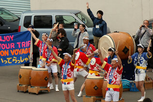Dann heißt es "Leinen los"! Begleitet von den rhythmischen Klängen einer japanischen Trommlergruppe auf der Pier nimmt die MS Bremen Fahrt auf, nicht ohne zum Abschied dreimal das Schiffstyphon ertönen zu lassen. Und zwar in einer Lautstärke, die so manchen Passagier erschrocken zusammenzucken lässt.