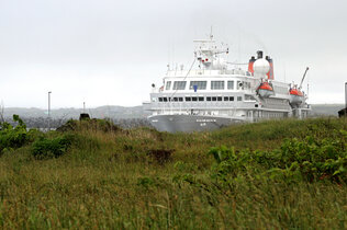 Später fährt die Bremen noch zwei weitere Passagen zwischen Vulkaninseln, aber auch hier ist die Sicht nicht so gut, sodass sich die Passagiere eher auf die Gangfolge des Abendessens und die Weinkarte konzentrieren.