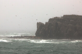 09.00 Uhr. Die Bremen erreicht Tyuleniy, einen riesigen Feldklotz, von starker Brandung umtost. Die nur knapp 650 Meter lange und 110 Meter breite Insel ist von Menschen unbewohnt, sie beherbergt jedoch eine der größten Kolonien des Nördlichen Seebären. Über der Insel kreisen riesige Schwärme von Lummen, in der Luft mischt sich ihr Geschrei mit dem Tosen des Meeres.
