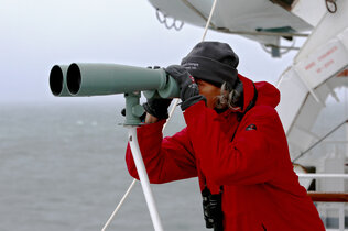 Wir reisen mit 13 Knoten mit Kurs auf die Halbinsel. Die See ist ruhig, manchmal blinzelt die Sonne durch den Nebel, das Frühstück im Club ist ein Vergnügen. Ein solcher Tag, an dem die meiste Zeit auf See verbracht wird, wird traditionell dazu genutzt, um das bisher Gesehene aufzuarbeiten und vertiefende Informationen zu geben. Und so verbringen wir den Vormittag mit der Stellerschen Seekuh, deren trauriges Schicksal (sie war schon 27 Jahre nach ihrer ersten Begegnung mit dem Menschen vollständig ausgerottet) den Passagieren vom Bordbiologen "Ha-Jo" Spitzenberger näher gebracht wird.