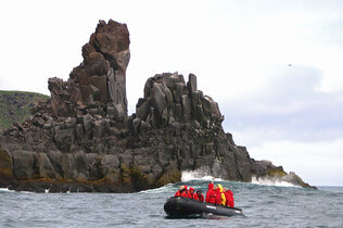 Nach 13.00 Uhr ist das zehn Meilen weiter nördlich gelegene Hall Island das nächste Ziel. Entlang der Küste soll eine Zodiac-Tour zu den Vogelkolonien und einer spektakulären Felsformation, dem Elephant Rock, führen. Die Ausbootung erweist sich als durchaus sportlich, denn am Sidegate kommen bis zu 1,5 Meter hohe Wellen an. Aber mittlerweile ist der Großteil der Passagiere recht geübt. Und nimmt auch – ohne mit der Wimper zu zucken – eine kalte Pazifikdusche in Kauf.