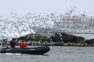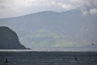 Sirius Point, ein Kap an der Nordwestspitze der Aleuten-Insel Kiska, ist – nach einem Vortrag über den Verkauf von Alaska durch Russland an die USA – der erste Programmpunkt der Bremen an diesem nebeligen Tag. Das Kap ist bekannt für seinen Vogelreichtum. Hunderttausende von Seevögeln nisten in den Felswänden, entsprechend dicht ist der Flugverkehr. Ganze Wolken verschiedener Alkenarten und Möwen sind in der Luft, es ist ein fantastisches Schauspiel, das die Passagiere in seinen Bann zieht.