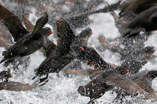 Häufig zu sehen sind Dickschnabellumme (schwarz-weiß gefärbt) und Trottellumme. Eissturmvögel gehören in die Gruppe der Röhrennasen. Sie sind mit Albatrossen verwandt und sehr gute Segelflieger. Der berühmte Papageitaucher (Hornlund) gehört genauso zu den Alken wie der Gelbschopflund. Sie brüten ganz oben auf den Felsen in Höhlen im Gras. Wir können aber auch hoffen, Räuber zu sehen – Wander- und Beringfalken sowie Weißkopf-Seeadler und Riesenseeadler mit einer Spannweite bis 2,30 Meter. Letztere sind nur auf der asiatischen Seite der Beringstraße zu sehen