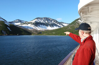 Gegen 16.00 Uhr schon wieder eine Attraktion! Dieses Mal ist es eine Schule Orcas (Schwertwale), die sich Steuerbord vor dem Schiff umhertreibt. Wir drehen bei und beobachten die Tiere vor der Felsenkulisse einer nahen Insel. Mehr als eine Stunde lang umkreisen die Orcas das Schiff. Besonders gut können wir sie von der heute offenen Brücke aus beobachten, wo man ab und zu auch eines der für die Passagiere bereitstehenden Ferngläser benutzen kann. Um 16.30 Uhr setzt der Kapitän einen Schlusspunkt, wir gehen wieder auf Kurs und lassen die Tiere zurück.