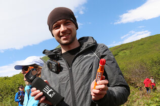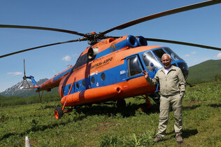 Vom Hubschrauber spazieren wir hinüber zu einem kleinen Fluss, dessen Wasser 38 Grad warm ist. Später wandern wir durch blühende Wiesen zum Parkzentrum mit kleinen Huts und Pools, in denen Einheimische und Ausflügler ein warmes Bad nehmen. Man weiß nicht, was man zuerst machen soll: Die Badehose anziehen oder das Fernglas suchen, denn plötzlich werden Bären gesichtet. Einige Exemplare sind etwa 500 Meter entfernt an einem Hang zu sehen. Wir beobachten und staunen, dann müssen wir zurück fliegen. Während der Rückfahrt zum Schiff bieten sich immer neue Aussichten über die Plattenbauten von Petropawlowsk hinweg auf die Vulkane.