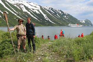 Beim Aufwachen kurz vor sechs Uhr präsentiert sich die Vulkankette Kamtschatkas im milden Morgenlicht. Wir fahren in die von Bergriesen gesäumte Russkaya-Bucht. Hier leben einige Fischer, Kajak-Sportler aus Petropawlowsk campen mit Zelten. Schnell erfahren wir, dass wir die geplante Wanderung zu einem Wasserfall oberhalb der verfallenden Gebäude nur in der Gruppe und in Begleitung russischer Guides unternehmen können, da gestern eine Bärenmama mit zwei Jungen genau dort gesichtet wurde. Tatsächlich finden wir die Losung, während wir zwischen kleinen Fischerhütten, Metallschrott und verfallenen Gebäuden über matschige Wiesen hinaufsteigen. Es ist richtig heiß geworden, und viele Passagiere schwitzen, weil sie aus lauter Angst vor "sibirischer Kälte" mit den Parkas angelandet sind, die bei Sonnenschein und 18 Grad viel zu warm sind.