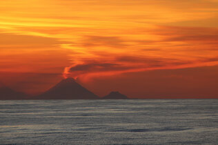 Kurz nach 22.00 Uhr geht die Sonne unter – und nur etwas später schält sich ein gigantischer, rauchender Vulkankegel aus der Dämmerung, dessen Gase gelbrote Muster auf einen rosafarbenen Himmel zeichnen: ein Ausbruch des Karymski, den wir schon am Vormittag von der anderen Seite sehen konnten.