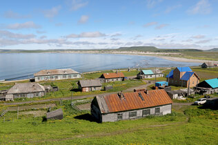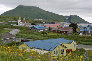 08.00 Uhr. Wir erreichen die Bering-Insel, die den Namen dieses Kommandanten der "Großen Nordischen Expedition" trägt, der hier seinen Forscherdrang letztendlich mit dem Leben bezahlt hat. Auf der kargen Insel leben einige hundert Menschen vom Volk der Aleuten in bunt bemalten Häusern, ihre Existenzgrundlage ist der Fischfang.