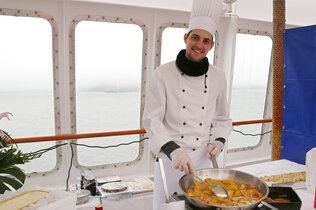 Zum Gaudium der Passagiere hat die Küchencrew mittlerweile eine Erbsensuppe mit Würsteln im Kessel angelandet, dazu gibt's seltsamerweise Champagner. Gegen 13.00 Uhr sind alle wieder zurück an Bord am Lido-Deck, dort gibt es ein Mittagsbuffet. Heute sitzen mehr Passagiere draußen, es ist der erste wirklich warme Tag der Reise. Angeblich aber gibt es in der Russkaya-Bucht jeden Sommer nur etwa zehn solche wunderbaren Tage.