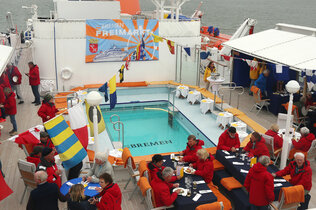 Nach dem Abendessen wird es an diesem Tag noch einmal so richtig gemütlich. Die "Nightingales", der berühmte Shanty-Chor der Bremen-Besatzung, tritt im Club auf. Und zwischendurch kommt die offizielle Seekarte, für die man zu einem guten Zweck Lose kaufen konnte, um 2.950 Euro an den Mann.