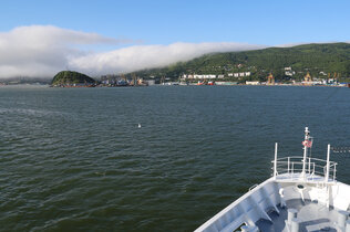 Am späten Nachmittag fährt die Bremen noch bei Nebel in die Awatscha-Bucht ein, an deren nordöstlichem Ende Petropawlowsk liegt, die Hauptstadt von Kamtschatka. Hier wird der Lotse an Bord genommen, der unser Schiff sicher in den Hafen geleiten soll. Das könnten die nautischen Offiziere auf der Brücke zwar auch alleine, doch hier herrscht Lotsenpflicht, der kein Schiff entgehen kann.