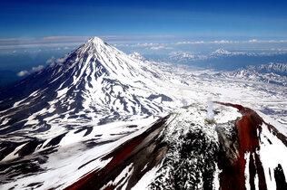 Im Konvoi geht es flussaufwärts. Auf der Backbordseite der von Schnee bedeckte, 2.800 Meter hohe Zhupanovski-Vulkan, an dessen Fuß der gleichnamige Fluss entspringt, voraus der 1.750 Meter messende Karymski, der zu den aktivsten Vulkanen auf Kamtschatka zählt. Auch heute stößt er wieder eine riesige Rauchfahne aus.