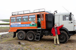 08.00 Uhr. Bei bedecktem Himmel fahren wir mit Gelände-Trucks zunächst durch Petropawlowsk und dann weiter hinaus in die Wildnis in Richtung Awatscha-Vulkan. Von einer Asphalt-Straße biegen unsere Transporter auf eine Piste ab, die zunächst ein ausgetrocknetes Flusstal den Hang hinauf führt. Der Nebel wird immer dichter, während sich der Truck über matschige Schneefelder weiter quält.