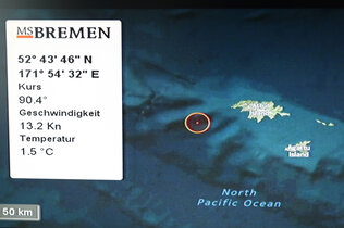Neuerlich haben wir die Borduhren in der Nacht um eine Stunde vorgestellt. Nach Hause sind es jetzt elf Stunden (die gleiche Zeitzone wie in Auckland, Neuseeland). Es ist fast windstill und mit 15 Knoten kommen wir optimal voran. Zum Frühstück im Club meldet sich der Kapitän und verkündet, dass wir durch günstigen Wind Zeit gewonnen haben und deshalb außerplanmäßig am morgigen Tag um die Mittagszeit die Aleuteninsel Attu ansteuern können. Da wir in der kommenden Nacht die Datumsgrenze überqueren werden, ist morgen übrigens noch einmal heute – aber dazu morgen mehr!