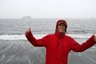 Nach einigen Schwierigkeiten findet die Crew einen winzigen, schwarzen Strandabschnitt, der durch vorgelagerte Felsen geschützt ist und an dem eine – durchaus bequeme – Anlandung möglich ist. Schon ab 8.00 Uhr wird ausgebootet. Der Nebel hat sich zu diesem Zeitpunkt schon etwas gelichtet, denn ein zeitweise scharfer Wind weht vom Meer übers Land. Die Farbenpracht der Wiesentundra ist überwältigend, sie wird nur unterbrochen von den Wanderwegen der sogenannten "Singenden Wühlmäuse", der einzigen Säugetiere, die die Insel bewohnen. Ihre Laute ähneln dem Gesang von Singvögeln. Einige wenige Passagiere, die sich ruhig verhalten und nicht schnell bewegen, bekommen die kleinen Nager auch zu Gesicht.
