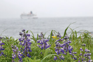 Und tatsächlich, es gelingt! Auf der Überfahrt werden die Passagiere durch Nieselregen und Spritzwasser befeuchtet. Und auch die Brandung ist stark, sodass man zwischen den Wellen aus dem Zodiac kommen muss, um nicht bis zum Bauch nass zu werden. Wie spazieren eine Straße mit verrosteten Kriegsrelikten entlang und schauen uns die Blumenwiese mit arktischen Lupinen an.