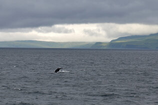 12.30 Uhr. Die Bremen läuft aus, Papageientaucher und Trottellummen begleiten das Schiff. Während des Essens am Lido-Deck unter freiem Himmel bietet der obligate Mittagswal, diesmal ein Pottwal, eine kostenlose Darbietung, die wir durchs mitgebracht Fernglas gut verfolgen können.