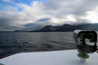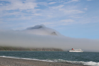 Nachdem alle wieder an Bord sind, werden "die Segel gesetzt", denn es gibt noch ein weiteres Ziel, das am Nachmittag erreicht werden soll: Chagulak gehört zu der kleinen Inselgruppe der Four Mountains. Auf der Insel erhebt sich der gleichnamige Vulkan, der sich zwar leider in dichte Wolken hüllt, nichtsdestoweniger aber während einer Umrundung mit dem Schiff bestaunt werden kann.