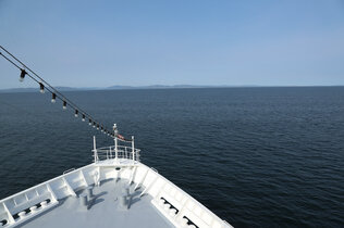 21.00 Uhr ist gleich 23.00 Uhr. Während der Nachspeise erreicht unseren Tisch mit der Nummer 24 die mehr oder weniger schockierende Nachricht, dass die Schiffsuhren in der Nacht um zwei Stunden vorgestellt werden – eine wahrlich kurze Nacht steht bevor. Nach Korsakov, unserem nächsten Hafen an der Südspitze der Insel Sachalin, sind es nur wenige Stunden durch die Soya-Straße.