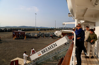 06.00 Uhr. Ankunft in Korsakov auf Sachalin. Bedeckt, drei Grad. Vom Kabinenfenster aus erkenne ich einen großen Hafen. Wir müssen hier zunächst einmal auf die russischen Behörden warten. Aber das ist Sache der Besatzung, die Passagiere gehen zuerst einmal gemütlich zum Frühstück – wie immer wird es entweder im Restaurant serviert oder man bedient sich am Buffet in der Panorama-Lounge. Hier gibt es auch einige Sitzplätze an Deck, wo man es sich unter Heizlampen bequem machen kann. Später müssen alle zur Gesichts- und Passkontrolle antreten, die recht professionell abläuft.